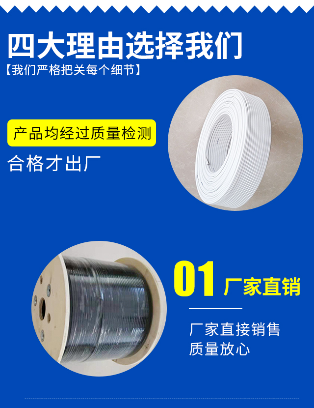 本公司生产的产品品种有:蝶形光缆、单芯、2芯、3芯、4芯、双芯独立等型号光缆,电话线、绑扎线、鼻梁条、钢绞线、分纤箱等,能为用户提供三十多种产品。可为用户提供来样品、来图加工定制非标产品,为使全面质量管理我们采取了一系列有效措施,建有产品检验中心和技术研发。
